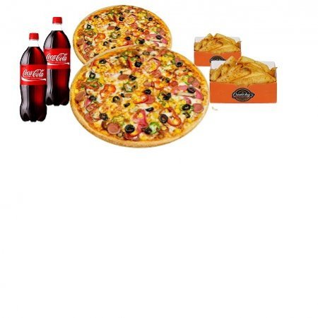(4-5 kişilik) 1 Extra büyük boy pizza, 1 Büyük boy pizza, 2 Porsiyon Patates kızartması, 2 adet 1 LT İçecek